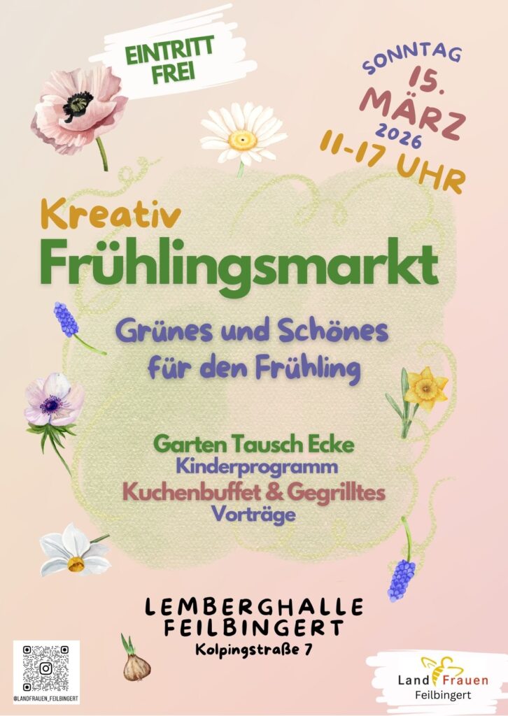 Am 15. März ist es endlich soweit und die Feilbingerter LandFrauen läuten den Frühling ein. Freut euch auf über 40 AusstellerInnen, interessante Vorträge, frisches Grün für den Garten und Leckeres aus der Region.